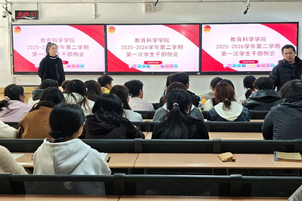 为强化学生干部的责任意识、服务意识与协作意识,凝聚工作合力,教育科学学院于2026年3月2日、8日分别在高台校区新文科楼116教室、新泉校区文科楼B206召开全体学生干部例会,院团委书记帕鲁克·甫拉提、副书记温孟鑫、辅导员孙海兰及全体学生干部参加会议。