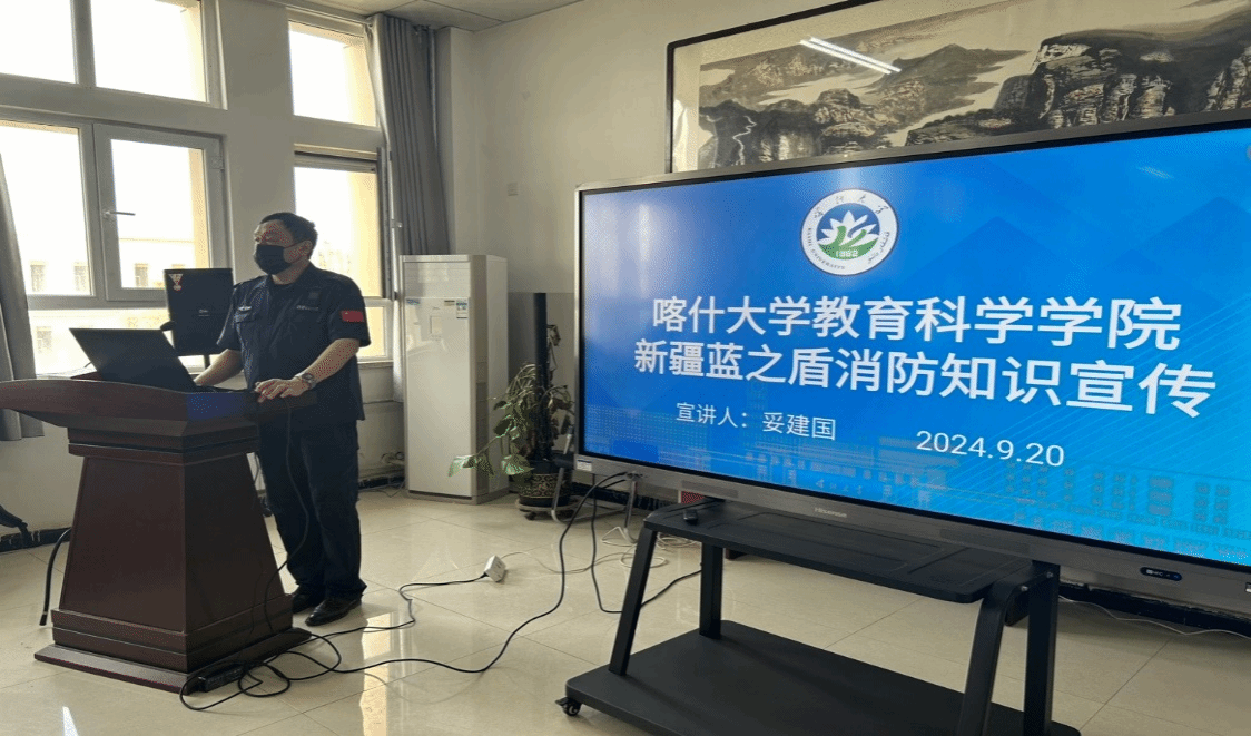 为提高广大师生的消防安全意识,2024年9月20日,喀什大学教育科学学院特邀请新疆蓝之盾消防知识宣传中心妥建国主任来我院开展防火宣传活动。宣传中心主任妥建国凭借其 15 年的丰富消防宣传经验,为学院师生带来了一场生动且实用的消防安全知识盛宴。