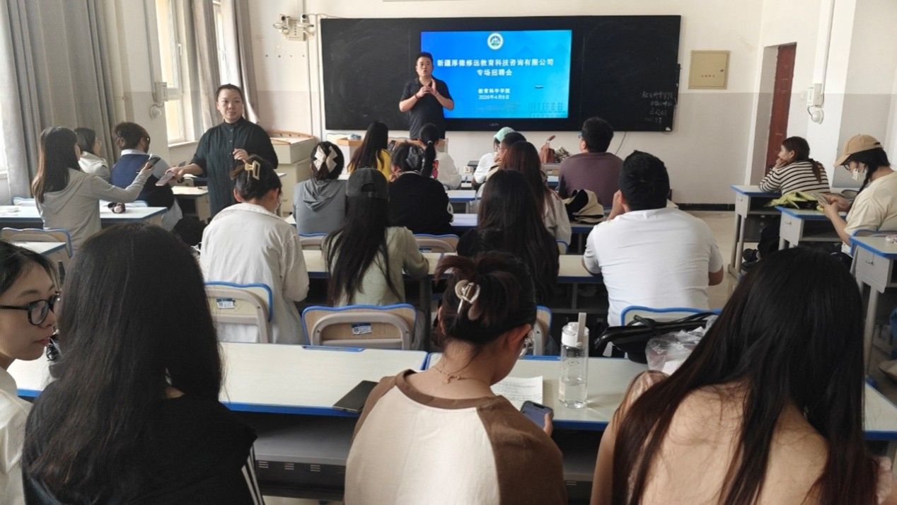 为扎实推进2026届毕业生就业工作,积极拓展优质岗位资源,4月8日,教育科学学院在文科楼A310教室组织开展了新疆厚德修远教育科技咨询有限公司专场招聘会。学院2026届毕业生踊跃参加。