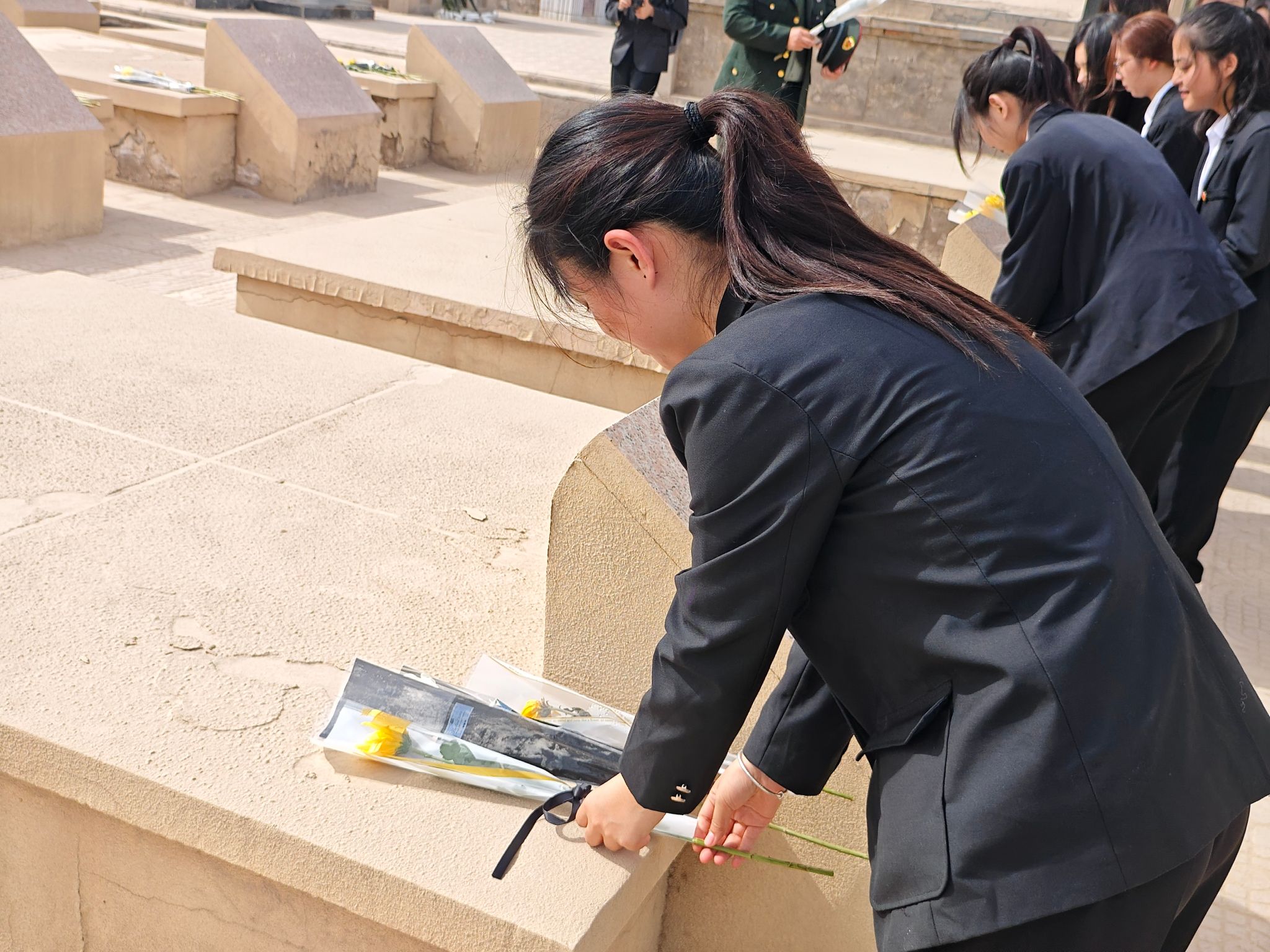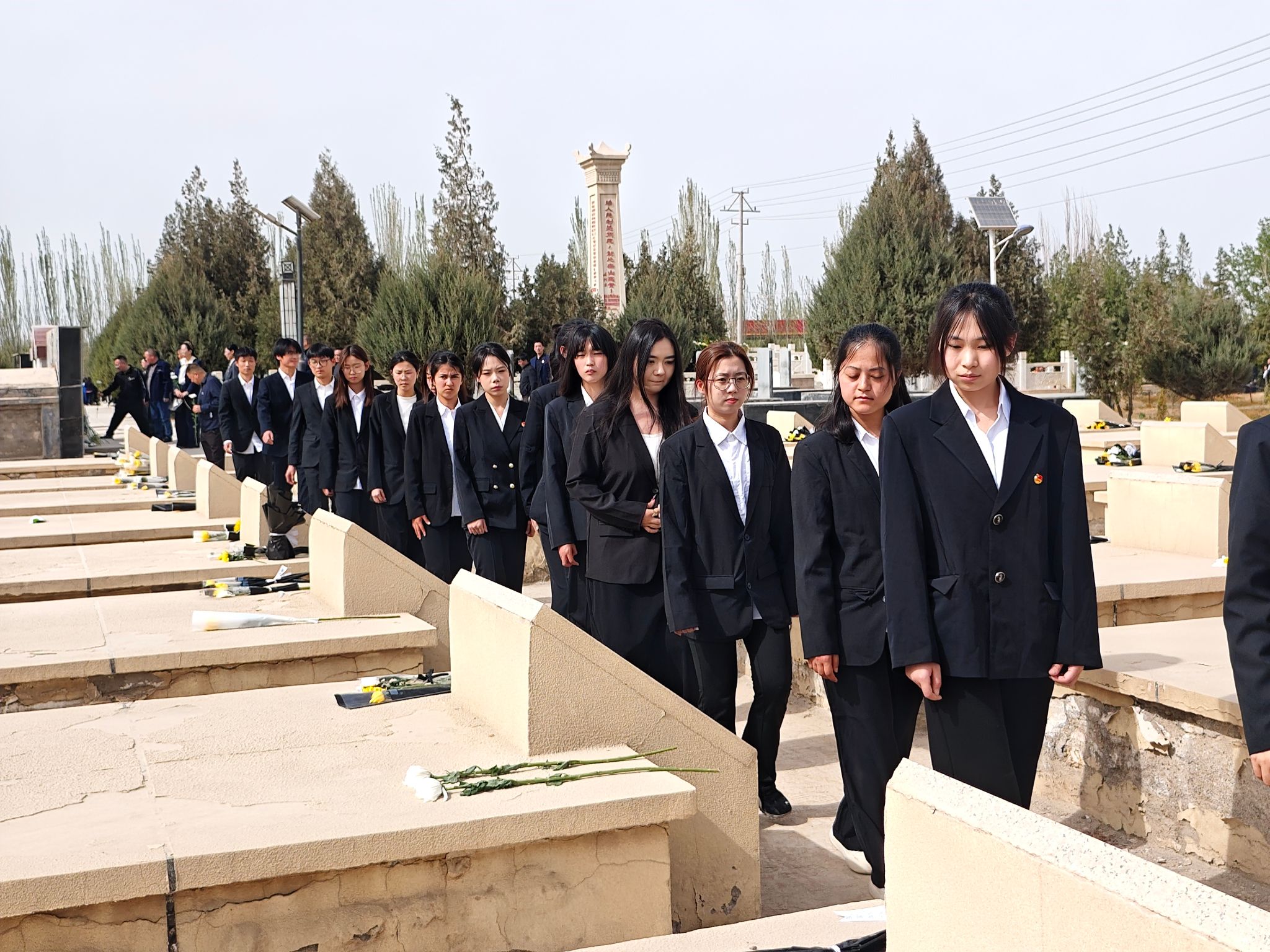 默哀结束后,全体人员依次缓步走向烈士纪念碑,将手中的鲜花轻轻放置在碑前,用朴素而庄重的方式,表达对英烈的深切哀思与崇高敬意。