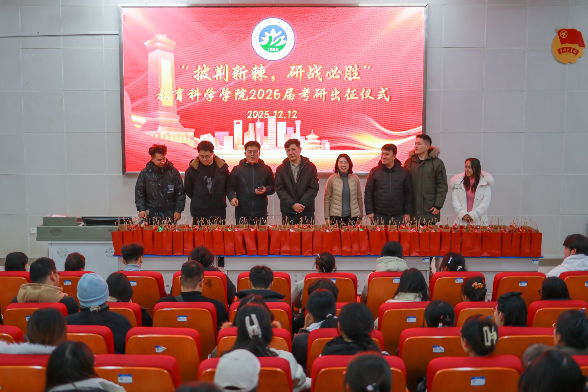 为传递学院关怀、提振学子士气,20251212日,教育科学学院“披荆斩棘,研战必胜”2026届考研出征仪式在文科楼002报告厅举行。学院党委书记余鹏、副书记赵宝,学工办主任刘相良、副主任史孔鹏,团委书记帕鲁克·甫拉提、副书记温孟鑫,辅导员张萌、海丽其姑丽·麦克克、塔力哈尔·阿曼太,学院报名2025年考研的本科生百余人参加活动。