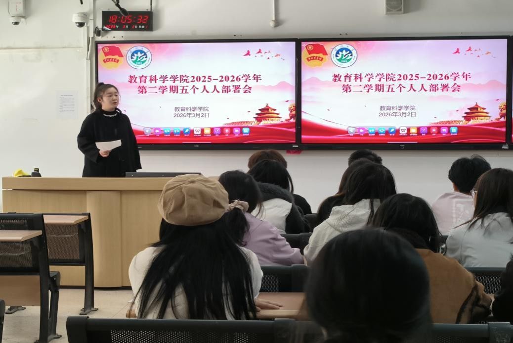 为扎实推进“五个人人”工作落地见效,教育科学学院于2026年3月2日、3月4日先后召开两场专题会议,分别面向学生和教职工进行部署与动员。