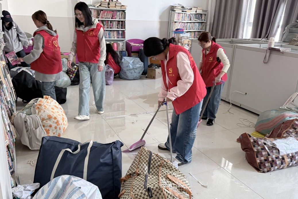 活动中,志愿者们齐聚文科楼实习生行李存放教室,对室内堆放的行李、杂物及卫生死角进行全面细致清理,认真擦拭台面、分类收纳杂物、规范物品摆放,不放过任何细节死角。经过协同努力,原本杂乱的教室焕然一新,整体环境整洁有序、宽敞明亮,切实为实习生打造了干净整洁、规范易用的物品存放空间,为学院后续教学开展、实践活动推进及校园环境优化奠定了坚实基础。