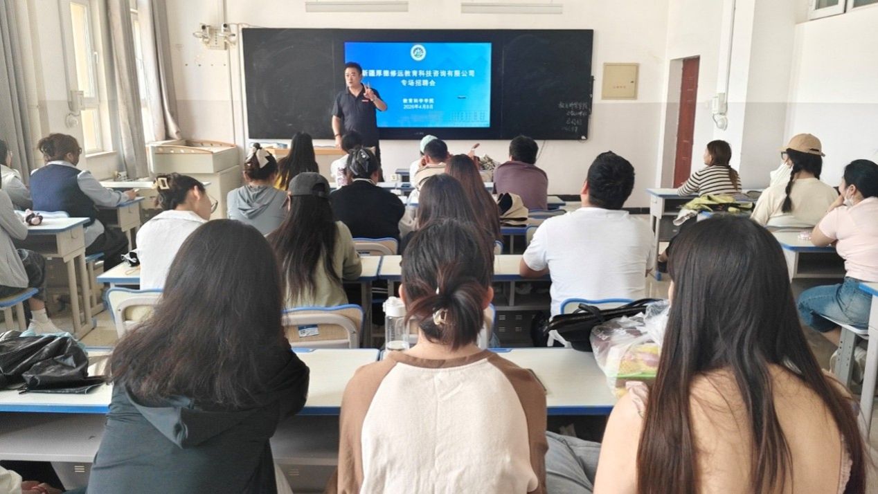 为扎实推进2026届毕业生就业工作,积极拓展优质岗位资源,4月8日,教育科学学院在文科楼A310教室组织开展了新疆厚德修远教育科技咨询有限公司专场招聘会。学院2026届毕业生踊跃参加。
