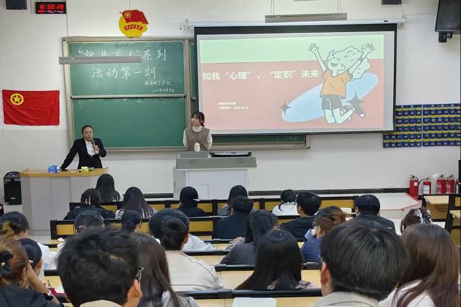 为切实做好师范生就业指导工作,帮助学生明晰就业形势、树立正确择业观,2025年10月15日,教育科学学院在新泉校区1号教学楼C108开展“就业育人”主题教育活动,本次活动主题为《知我“心理”,“定职”未来》。教育科学学院心理学教研室专任教师刘俊丽主持活动,来自小学教育的80余名毕业年级本科生参加本次活动。