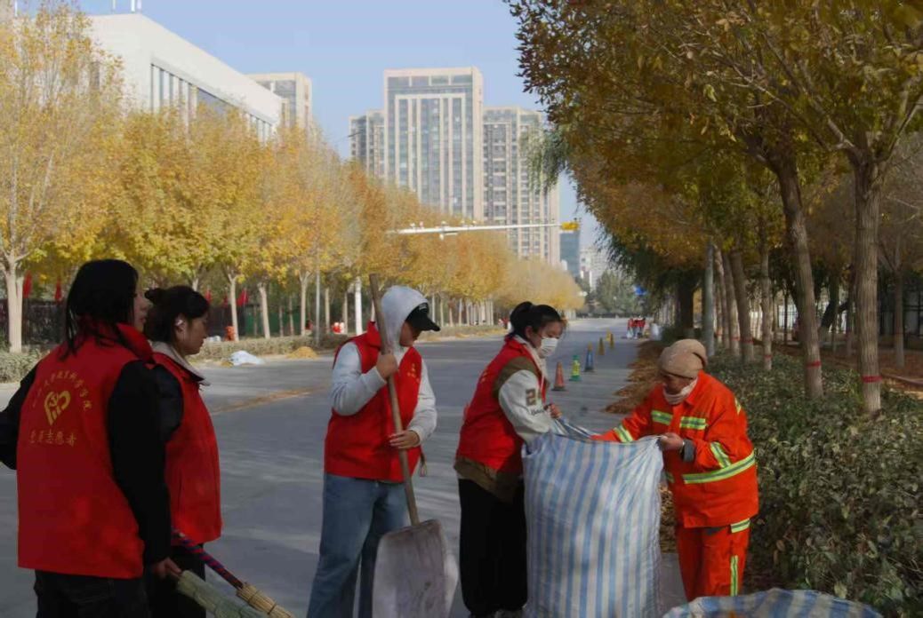 在环卫工人的现场指导下,志愿者们认真学习、仔细操作,逐渐掌握了清扫的要领。随后,志愿者们分成小组,与现场的环卫工人默契配合。有人用扫帚将落叶归拢成堆,有人手持铲子将落叶装入垃圾袋,还有人负责将装满的袋子集中堆放。除了清扫落叶,同学们还将散落在路边和绿化带中的塑料瓶、纸屑等杂物一一捡起,不放过任何一个卫生死角。